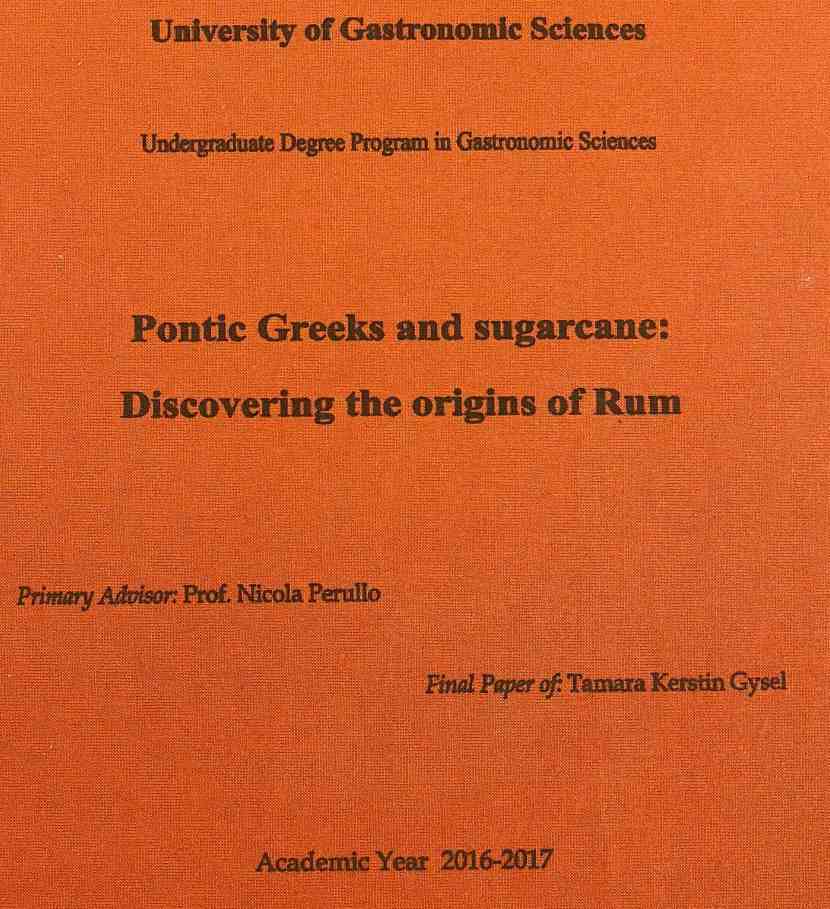Tamara Kerstin Gysel hat sich im Jahr 2017 im Rahmen einer Bachelor Arbeit, aufgrund einer Studienreise nach Genisea im Osten Griechenlands, mit den Ursprüngen vom Genussmittel Rum und dessen geschichtlichen Hintergründen auseinandergesetzt.